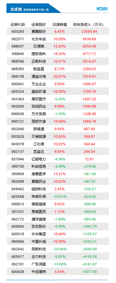 盘后数据显示,10月20日龙虎榜中,共33只个股出现了机构的身影,有18只股票呈现机构净买入,15只股票呈现机构净卖出。当天机构净买入前三的股票分别是赛腾股份、北方华创、芯源微;当天机构净卖出前三的股票分别是中远海特、广东鸿图、合力科技。
