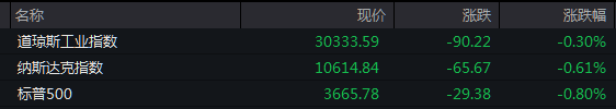 美东时间周四,在美联储多位官员发表鹰派言论的情况下,美债收益率继续攀升,三大指数冲高回落。截至收盘,道指跌90.22点,跌幅0.30%;纳指跌65.66点,跌幅为0.61%;标普500指数跌29.38点,跌幅为0.80%。