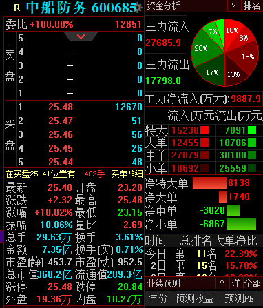 10月21日,中船防务涨停,报25.48元,成交额7.35亿元,换手率3.61%。