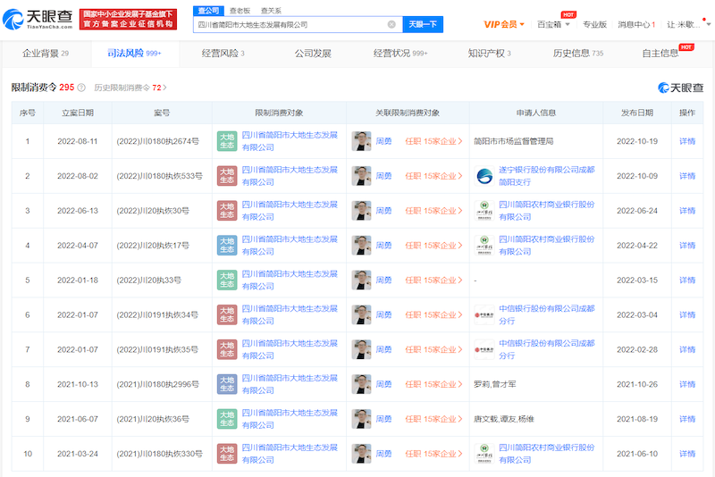 此外,该公司近日再新增一则限制消费令,限制消费对象为该公司及法定代表人周勇(公开资料显示为艺人周震南的父亲),申请人为简阳市市场监督管理局。