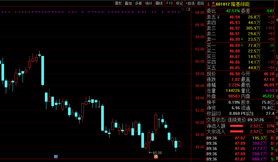 10月25日早盘,“光伏茅”隆基绿能逆市反弹。截至发稿报46.90元,涨2.22%。