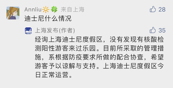 上海发布微信号回复,经询上海迪士尼度假区,没有发现有核酸检测阳性游客来过乐园。目前所采取的管理措施,系根据防疫要求所做的配合协查,希望游客予以谅解与支持。上海迪士尼度假区今日正常运营。