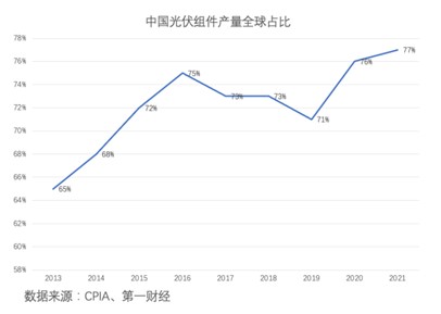 “但海外市场一直是主要市场。”上述光伏组件上市公司相关人士称。CPIA数据显示,2013-2021年,我国光伏组件产量全球占比始终保持在65%以上,最高记录为2021年的逾76%。