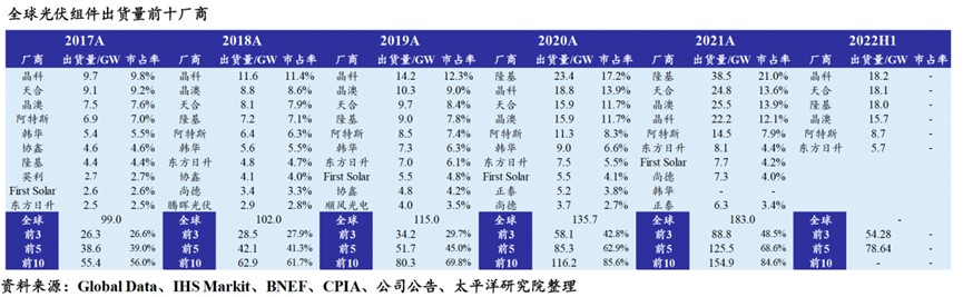 这一成长期也伴随着我国光伏产业竞争力的持续迭代提升。晶科能源(JKS.N;688223.SH)、天合光能(688599.SH)、隆基绿能(601012.SH)、晶澳科技(002459.SZ)2018年以来组件出货量稳居全球前四,2018-2021年四家企业全球市占率合计分别达35%、37.5%、54.5%、60.6%,光伏组件四巨头格局逐渐成型。