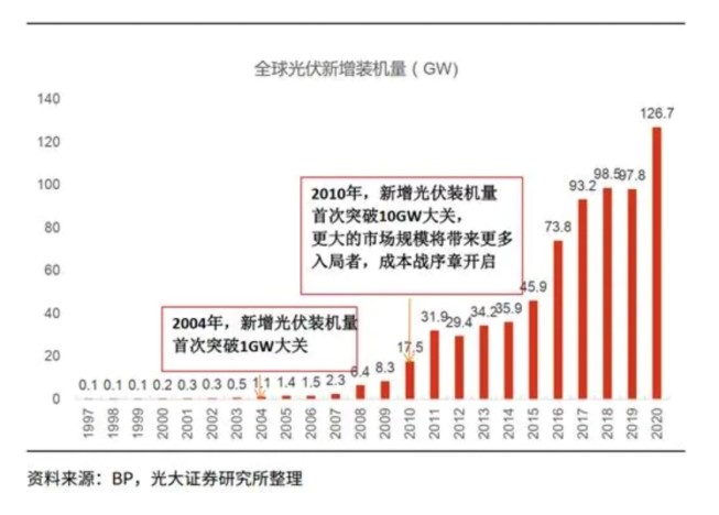 此后到2010年,是光伏行业第一个快速发展周期,也是海外光伏市场的放量期。