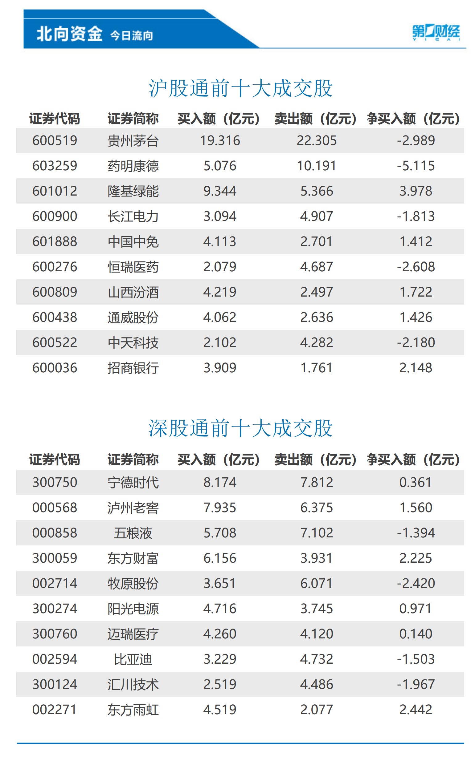 前十大成交股中,净买入额居前三的是隆基绿能、东方雨虹、东方财富,分别获净买入3.98亿元、2.44亿元、2.23亿元。