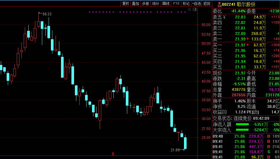 10月28日早盘,歌尔股份闪崩大跌。截至发稿报21.97元,跌9.51%,盘中一度触及跌停。