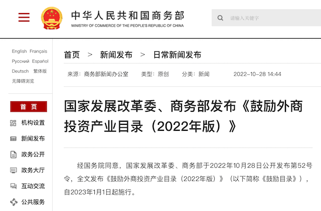 据商务部网站28日消息,经国务院同意,国家发展改革委、商务部于当日发布《鼓励外商投资产业目录(2022年版)》(下称《鼓励目录》),自2023年1月1日起施行。