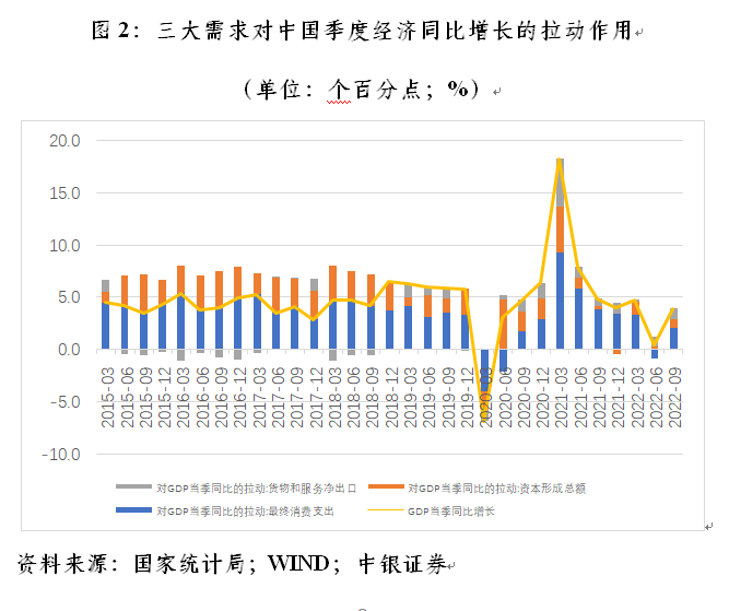 三季度,中国经济同比增长3.9%。从支出法看,消费、投资和净出口对当季经济增长分别拉动2.0、0.8和1.1个百分点,环比分别上升2.9、0.5和0.1个百分点(见图2)。可见,当季三大需求对经济增长拉动作用均进一步增强,只是消费拉动的改善更为明显。