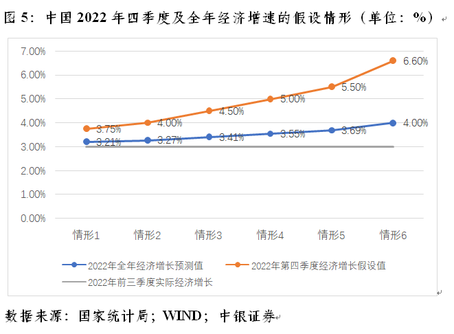 最近,国际货币基金组织(IMF)更新了世界经济展望,预计今年中国经济增长3.21%,明年增长4.44%。前三季度,中国经济累计同比增长3.0%,四季度经济同比增速不低于3.75%,就可以达成IMF的预测值。如果中国经济四季度增长4%,则全年有望增长3.27%;如果四季度增长5%,则全年有望增长3.55%;如果全年中国经济要增长4%以上,则四季度同比增速要不低于6.60%(见图5)。