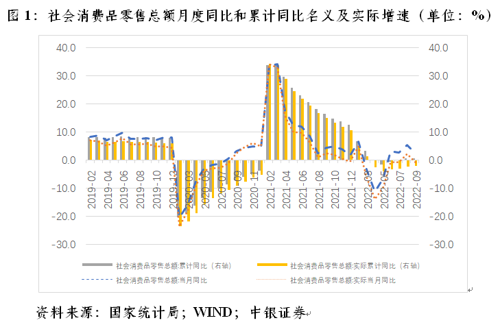 今年二季度,由于受到疫情多点散发的严重冲击,消费拖累当季经济增长0.8个百分点,对经济增长贡献率为负。随着二季度后半段以来高效统筹疫情防控和经济社会发展,积极推动一系列促消费政策落地显效,三季度消费市场总体保持恢复增长态势。当季,社会消费品零售总额同比增长3.5%,二季度下降4.6%。前三季度,社零累计同比增长0.7%,较上半年增速高出1.4个百分点;社零累计同比实际下降2.1%,较上半年实际增速回升1.3个百分点(见图1)。