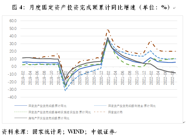 前三季度,社零累计同比增速较前两年同期复合平均增速低3.2个百分点,且绝对增速也低于固定资产投资5.2个百分点。然而,投资却不是当前经济恢复的主要驱动力,主要原因有三:一是固定资产投资与支出法中的资本形成统计口径不同。2017~2021年,年度资本形成平均仅相当于固定资产投资额的74%。二是民间投资和房地产开发投资对固定资产投资拖累加大。前三季度,民间投资增长2.0%,增速较上半年回落1.5个百分点;房地产开发投资下降8.0%,降速加快2.6个百分点(见图4)。三是PPI涨幅较高影响投资的实物贡献。前三季度,PPI累计同比增长5.9%,高出同期CPI增速3.9个百分点。