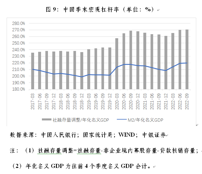 从去年下半年重提做好跨周期调节,保持经济运行在合理区间以来,人民银行坚持稳健的货币政策灵活适度,科学管理市场预期,切实服务实体经济,有效防控金融风险。在某些方面,货币政策对实体经济支持的力度超过了2020年疫情冲击最严重的时期,M2同比增速处于2016年5月份以来的高点,市场利率也处于近年来甚至史上的低位(见图8)。到今年9月末,以社融存量调整和M2与年化名义GDP之比衡量的宏观杠杆率,均创下史上新高(见图9)。
