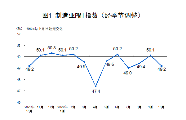 国家统计局31日发布的2022年10月份中国制造业采购经理指数(PMI)为49.2%,比上月下降0.9个百分点,在连续2个月环比上升后再次下降。