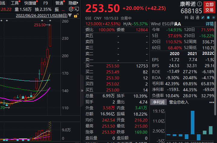 11月2日,受利好消息刺激,康希诺AH股双双大涨。截至发稿,A股康希诺录得20%涨停,报253.5元,该股10月以来累计涨超109%。