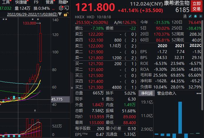 截至发稿,H股康希诺生物涨41.14%,报121.8港元,该股此前一度涨超50%。
