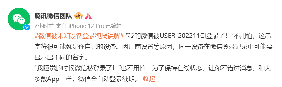 11月3日,@腾讯微信团队发文称,微信被未知设备登录纯属误解。