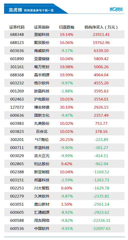11月3日龙虎榜中,共25只个股出现了机构的身影,有13只股票呈现机构净买入,12只股票呈现机构净卖出。当天机构净买入前三的股票分别是昱能科技、聚辰股份、南威软件,净买入金额分别是2.39亿元、1.98亿元、6339万元。当天机构净卖出前三的股票分别是中国软件、用友网络、汇通能源,净流出金额分别是3.21亿元、2.23亿元、2924万元。