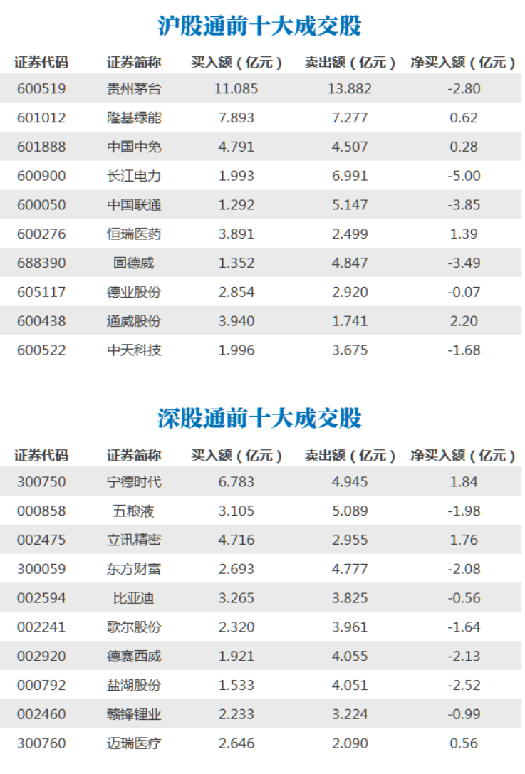11月3日,北向资金合计净卖出45.65亿元,其中沪股通净卖出23.08亿元,深股通净卖出22.57亿元。前十大成交股中,净买入额居前三的是通威股份、宁德时代、立讯精密,分别净买入2.2亿元、1.84亿元、1.76亿元。净卖出额居前三的是长江电力、中国联通、固德威,分别获净卖出5亿元、3.85亿元、3.49亿元。