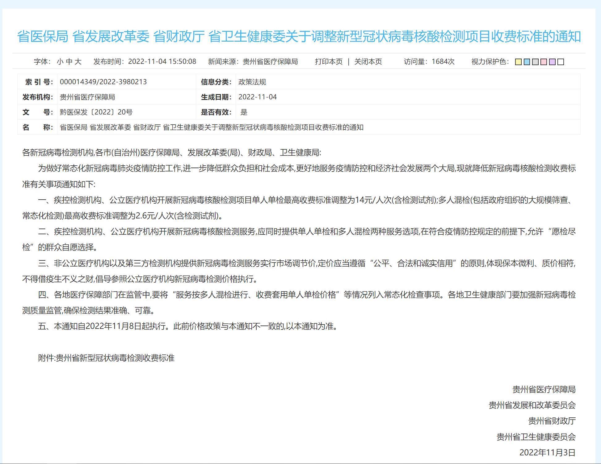 11月4日,贵州省医保局、省发展改革委、省财政厅、省卫生健康委四部门下发关于调整新型冠状病毒核酸检测项目收费标准的通知。疾控检测机构、公立医疗机构开展新冠病毒核酸检测项目单人单检最高收费标准调整为14元/人次(含检测试剂);多人混检(包括政府组织的大规模筛查、常态化检测)最高收费标准调整为2.6元/人次(含检测试剂)。疾控检测机构、公立医疗机构开展新冠病毒核酸检测服务, 应同时提供单人单检和多人混检两种服务选项,在符合疫情防控规定的前提下,允许“愿检尽检”的群众自愿选择。通知还提出,非公立医疗机构以及第三方检测机构提供新冠病毒检测服务实行市场调节价,定价应当遵循“公平、合法和诚实信用”的原则,体现保本微利、质价相符,不得借疫生不义之财,倡导参照公立医疗机构新冠病毒检测价格执行。