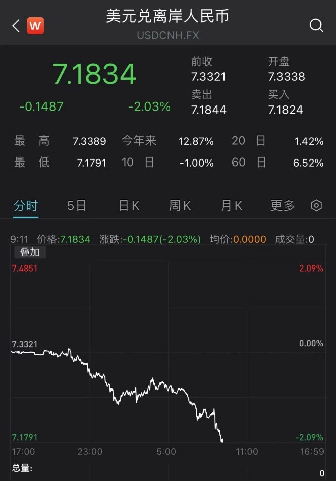 11月4日,离岸、在岸人民币兑美元持续拉升。离岸人民币兑美元日内涨超1500点,收复7.18关口。在岸人民币兑美元日内涨超1300点,收复7.20关口。