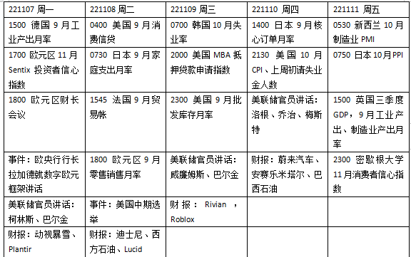 上周美联储召开议息会议,连续第四次加息75个基点符合市场预期。美联储暗示,此次加息后考虑从12月开始放慢步伐,但最终利率可能会高于9月的预期,不过未来的政策决定仍将取决于数据。本周多位美联储官员将发表例行讲话,市场关注有关经济前景和政策路径的最新表态。