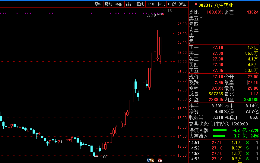 11月7日,众生药业高开高走,早盘便封死涨停直至收盘,为连续2个交易日涨停。