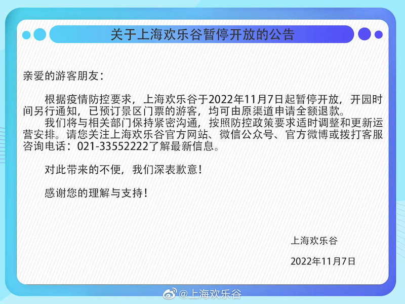 上海欢乐谷官方微博11月7日发布关于上海欢乐谷暂停开放的公告称,根据疫情防控要求,上海欢乐谷于2022年11月7日起暂停开放,开园时间另行通知,已预订景区门票的游客,均可由原路径申请全额退款。