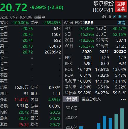 11月9日,歌尔股份开盘一字跌停,报20.72元,换手率0.53%。