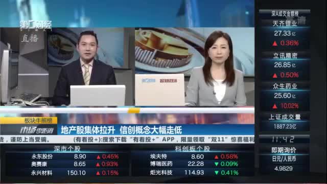 早盘地产股集体拉升,阳光城涨停,金地集团、新城控股、滨江集团、招商蛇口涨超5%,华发股份、金科股份、新华联等跟涨。软件、信创概念股开盘大幅走低,竞业达跌停,格尔软件、久其软件、南天信息、中国软件、科创信息、荣联科技等跌超6%。