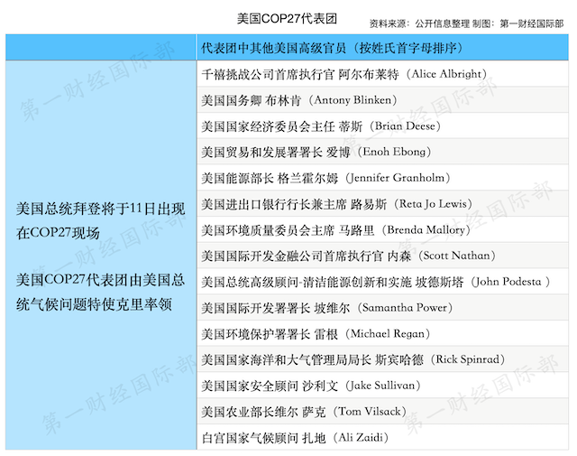 此次,拜登政府面临中期选举,但仍派出了强大阵容,高调回归COP会场。据美国国务院信息显示,此次阵容中包括美国国务卿布林肯、美国国家安全顾问沙利文、美国能源部长格兰霍尔姆、美国国家经济委员会主任蒂斯和美国进出口银行行长兼主席路易斯等人。