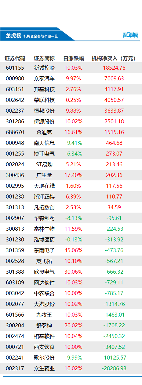 当天机构净买入前三的股票分别是新城控股、众泰汽车、邦基科技,净买入金额分别是1.85亿元、7010万元、4118万元。