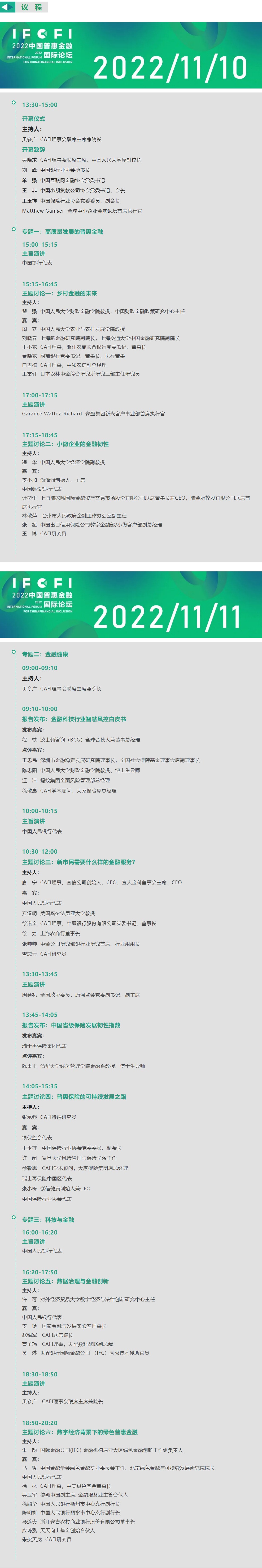 此次论坛于2022年11月9日-11月11日在北京召开,来自监管机构、学术机构和各主流金融机构的代表将共同就乡村金融、小微企业的金融韧性、新市民所需的金融服务、普惠保险、数据治理,以及数字经济背景下的绿色金融等议题开展讨论。其中,11月10日下午及11月11日全天的议程将通过第一财经网端进行直播。