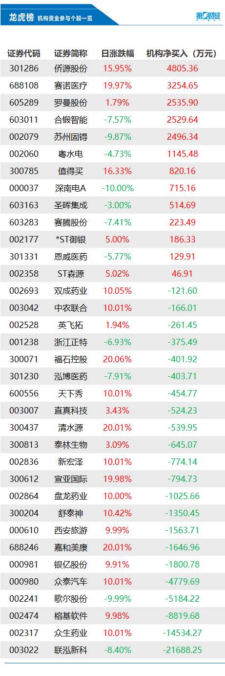 当天机构净买入前三的股票分别是侨源股份、赛诺医疗、罗曼股份,净买入金额分别是4805万元、3255万元、2536万元。
