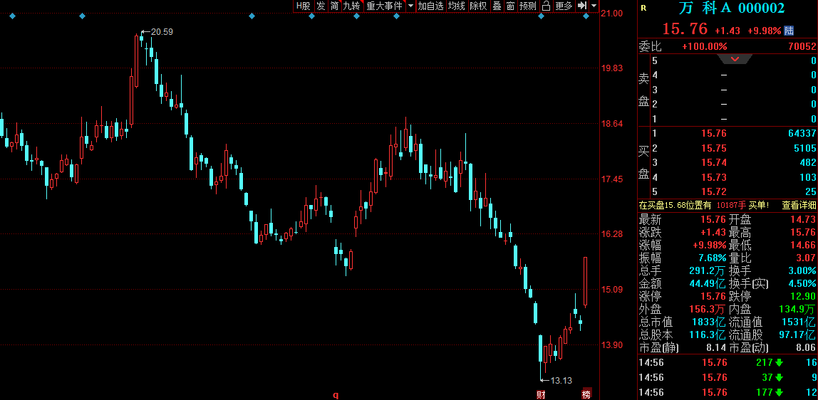 万科A今日涨停,报收15.76元,全天成交44.49亿元。