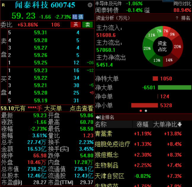 11月18日,闻泰科技低开低走,盘中一度跌超3%,截至发稿,该股跌2.73%,报59.23元。