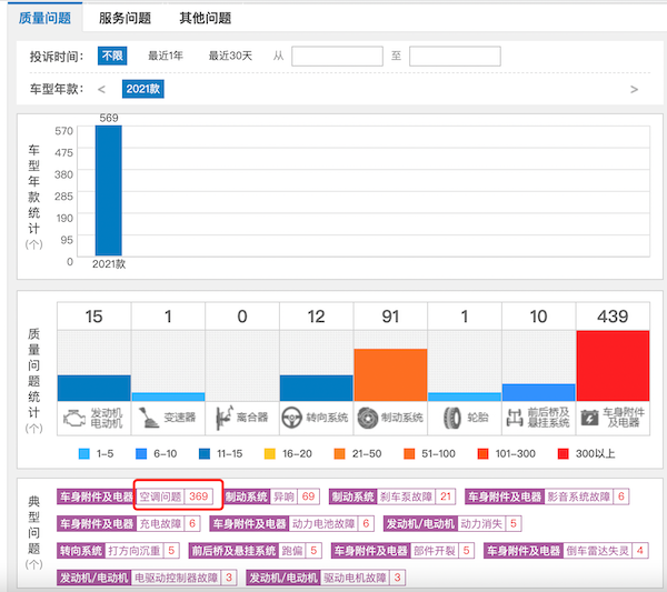 第一财经记者从车质网获悉,截至11月20日,比亚迪海豚关于质量问题的总投诉量为569起,其中,跟空调问题相关的投诉达到369起,占比近65%。从今年10月中旬起,陆续有车主投诉比亚迪海豚“空调出风口喷出白色粉末”。11月10日,有车主在上述投诉网站称,“海豚空调出风口喷白色粉末,之前以为是灰尘没太在意,10月中旬仔细观察是白色粉末,风量开大时,甚至还会瞬间吹如小米粒般的小白片。”