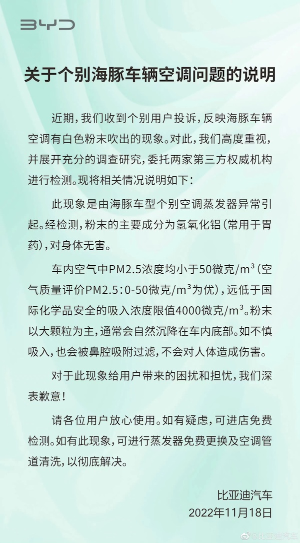 针对上述问题,比亚迪(002594.SZ)18日发文回应称,比亚迪海豚喷粉末现象是由海豚车型个别空调蒸发器异常引起,经检测,粉末的主要成分为氢氧化铝(常用于胃药),对身体无害。