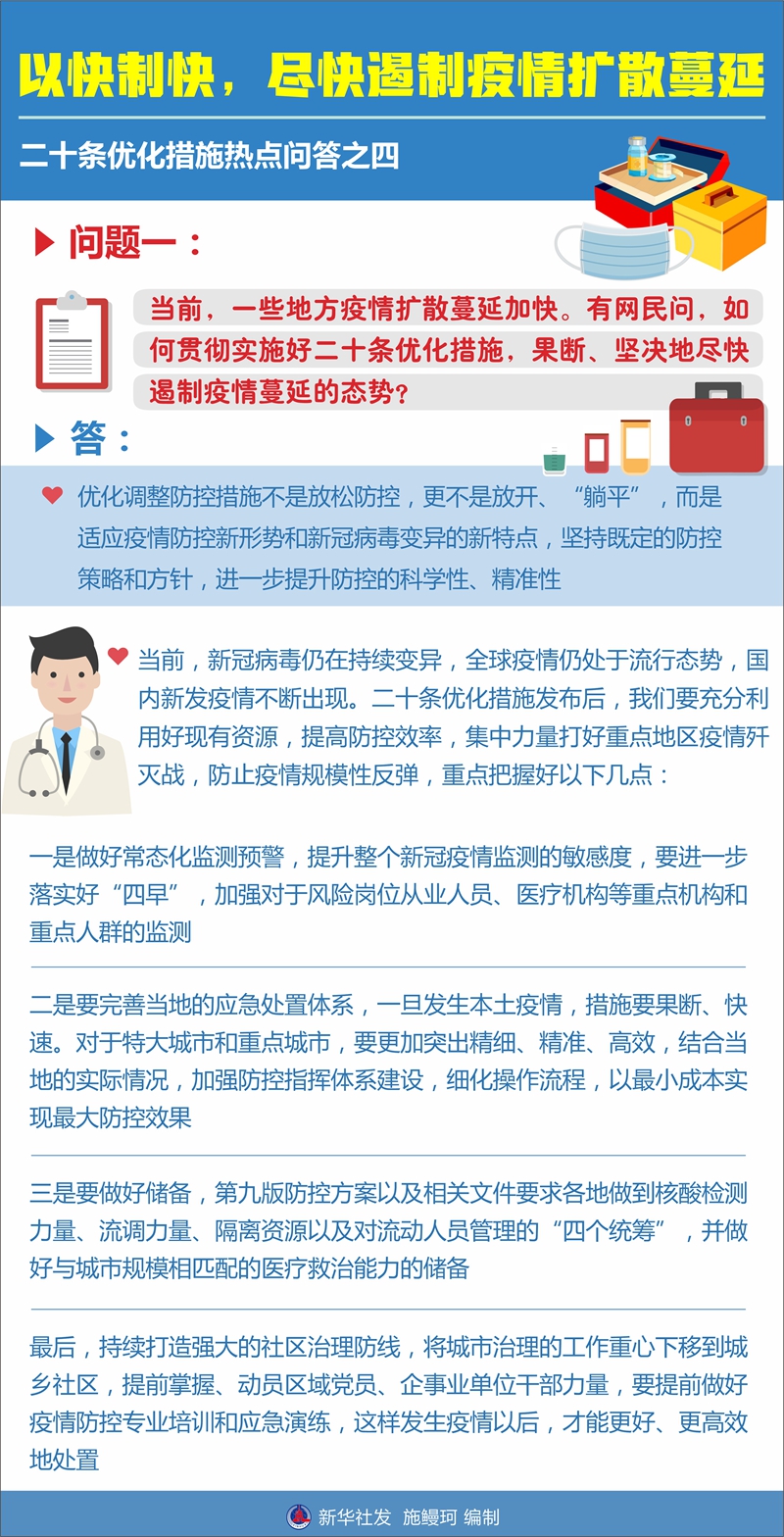 问题一:当前,一些地方疫情扩散蔓延加快。有网民问,如何贯彻实施好二十条优化措施,果断、坚决地尽快遏制疫情蔓延的态势?