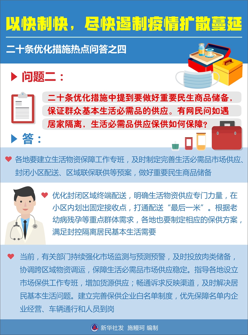 问题二:二十条优化措施中提到要做好重要民生商品储备,保证群众基本生活必需品的供应。有网民问如遇居家隔离,生活必需品供应保供如何保障?