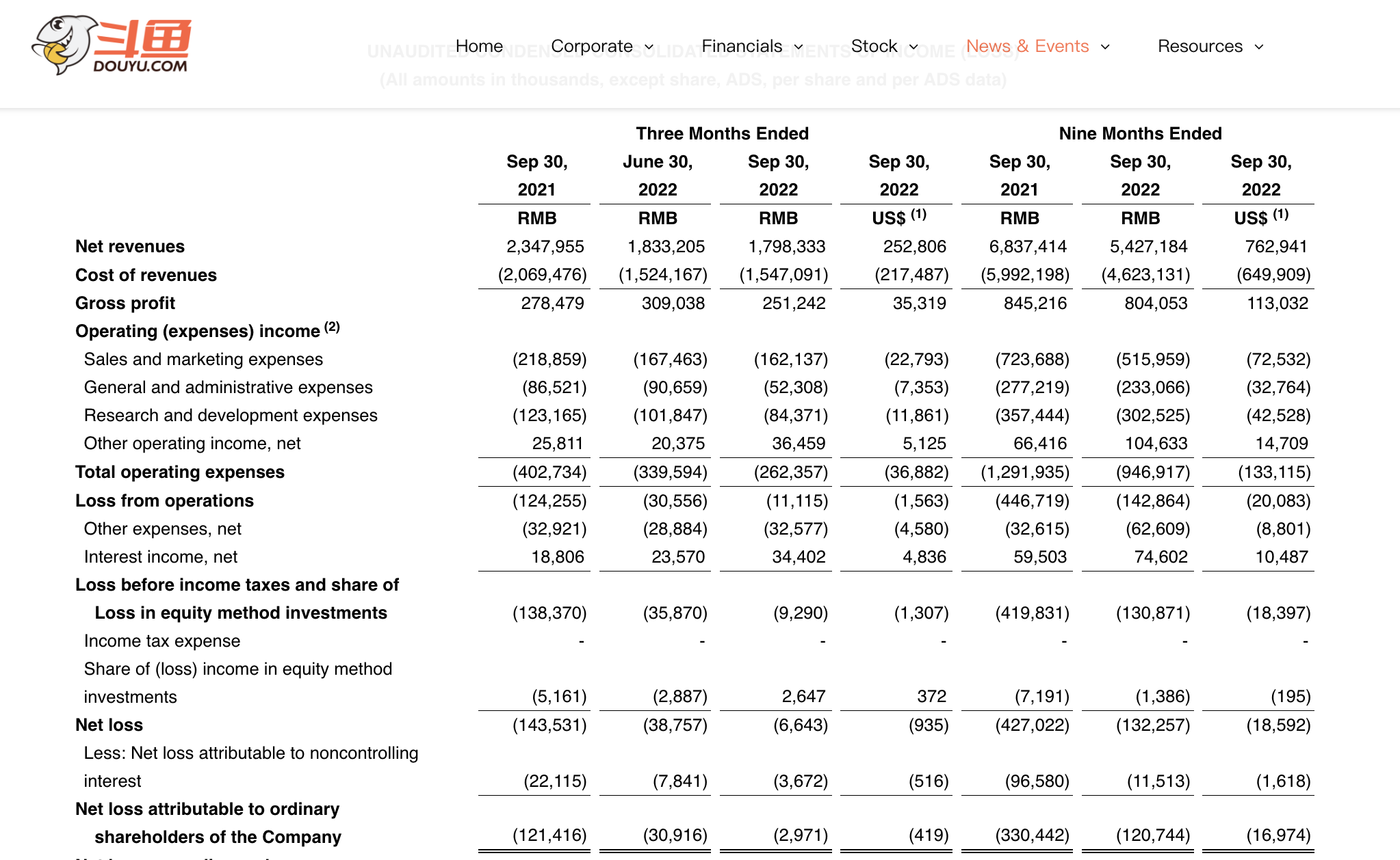 虎牙公司财务副总裁吴欣表示,第三季度虎牙的总运营费用同比减少了27.3%,“鉴于市场环境的波动,我们将继续保持审慎,并巩固业务和财务基础。”