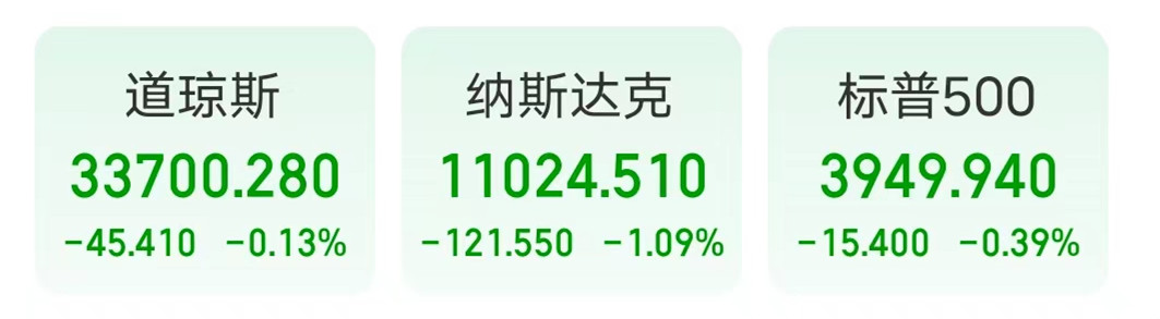 当地时间周一,美股三大指数集体下挫,截至收盘,标普500指数收跌15.40点,跌幅0.39%,报3949.94点。道指收跌45.41点,跌幅0.13%,报33700.28点。纳指收跌121.55点,跌幅1.09%,报11024.51点。