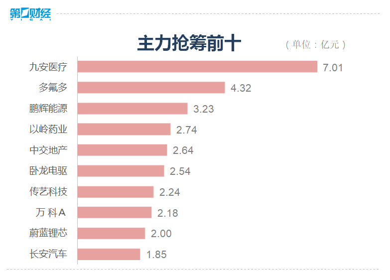 具体到个股来看,九安医疗、以岭药业、多氟多、中交地产、科力远分别获净流入12.03亿元、6.44亿元、5.92亿元、4.68亿元、4.38亿元。净流出方面,贵州茅台、宁德时代、粤传媒、比亚迪、五粮液分别遭净流出5.36亿元、3.73亿元、3.23亿元、3.2亿元、3.05亿元。