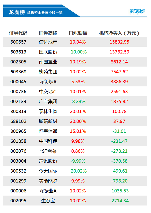 11月28日龙虎榜中,共17只个股出现了机构的身影,有9只股票呈现机构净买入,8只股票呈现机构净卖出。当天机构净买入前三的股票分别是信达地产、国联股份、南国置业,净买入金额分别是1.59亿元、1.38亿元、8612万元。当天机构净卖出前三的股票分别是生意宝、深振业A、美能能源,净流出金额分别是2714万元、1036万元、798万元。