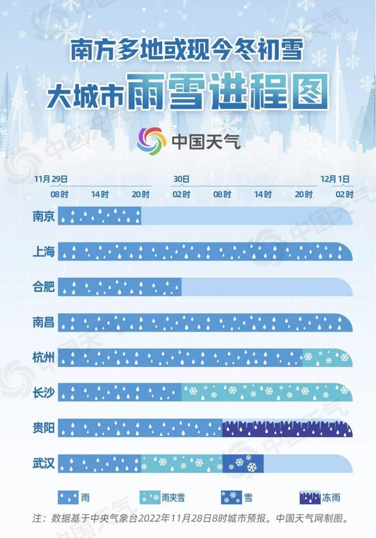 今冬以来最强寒潮正在影响我国。随着寒潮主体南下,11月29日夜间开始,南方部分地区将会出现雨雪转换,多地或迎今冬初雪,部分地区还将有冻雨。(中国天气网)