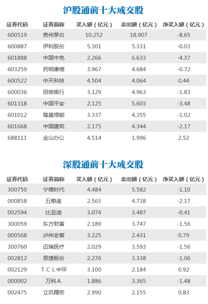 11月28日,统计数据显示北向资金全天净卖出37.6亿元,其中沪股通净卖出41.7亿元,深股通净买入4.1亿元。前十大成交股中,净买入额居前三的是金山办公、TCL中环、立讯精密,分别净买入2.52亿元、0.92亿元、0.83亿元。净卖出额居前三的是贵州茅台、中国中免、中国平安,分别获净卖出8.65亿元、4.37亿元、3.48亿元。