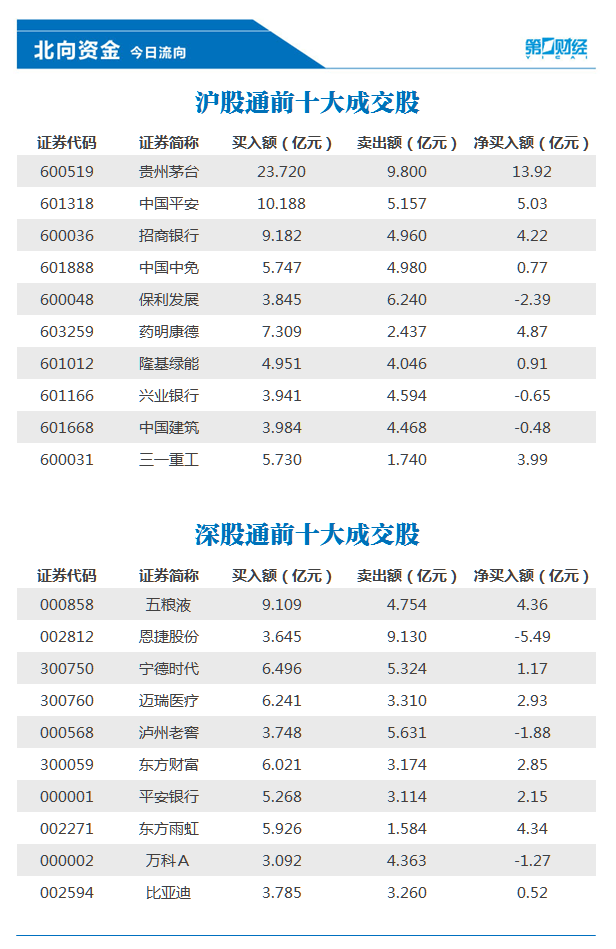 前十大成交股中,净买入额居前三的是贵州茅台、中国平安、药明康德,分别净买入13.92亿元、5.03亿元、4.87亿元。