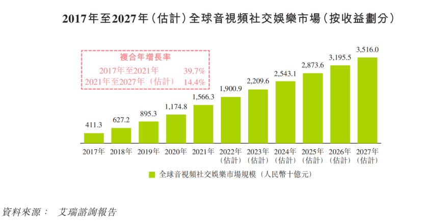 过去五年,全球音视频社交娱乐市场经历强劲增长。艾瑞咨询报告显示,全球音视频社交娱乐市场由2017年的人民币4,113亿元增长至2021年的人民币15,663亿元,复合年增长率为39.7%。同时预测,未来五年全球音视频社交娱乐市场仍将保持较快速度增长,并将于2027年达人民币35,160亿元市场规模,2021年至2027年的复合年增长率为14.4%。