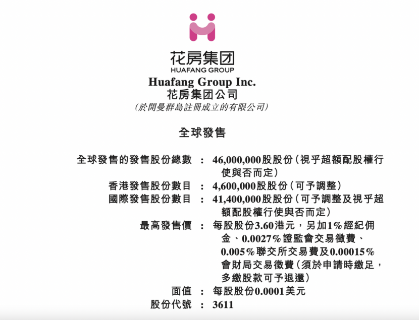 本次IPO,花房集团拟全球发售4600万股,其中国际配售4140万股,占总发行数量90%,香港公开发售460万股,占总发行数量10%,预计发行价介乎每股2.8港元至3.6港元,每手1000股。