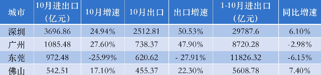 从前10个月数据看,深圳、广州和佛山进出口数据初显复苏态势。